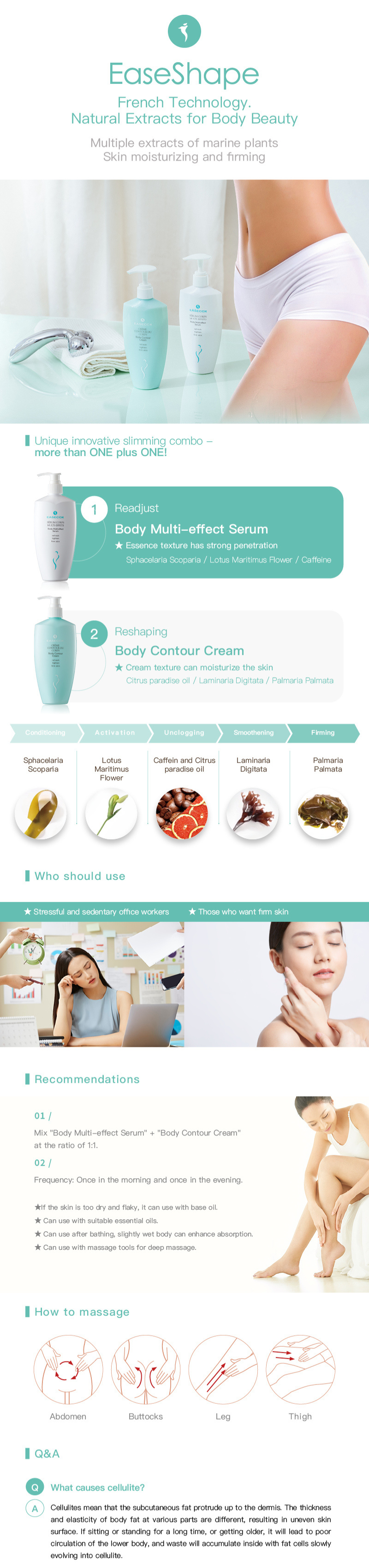 Multiple plants extracts derived using innovative biotechnology for efficient absorption to smooth, firm, and refine stubborn cellulite.
